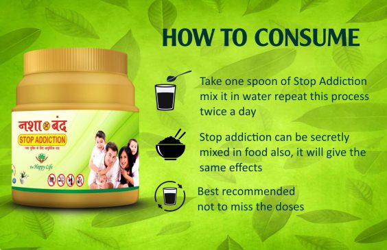 Nasha Band is a remedy for addiction. It is a combination of many herbs like Vidarikand, Amla, Harar Kali, Brahmi, Neem, Lavang (Clove) and other numerous herbs in small quantity. One can use Nasha Band with or without the knowledge of the addicted person. To achieve this, just mix Nasha band powder in any of the veg or non-veg food item. It does not change the colour, moreover do not change taste of that food item. Sprinkling Nasha Band powder on cooked foods, like veg & non-veg curries, fruit juices, tea, coffee, stuffing in paratha, curd, dal, omelette etc will do the trick.